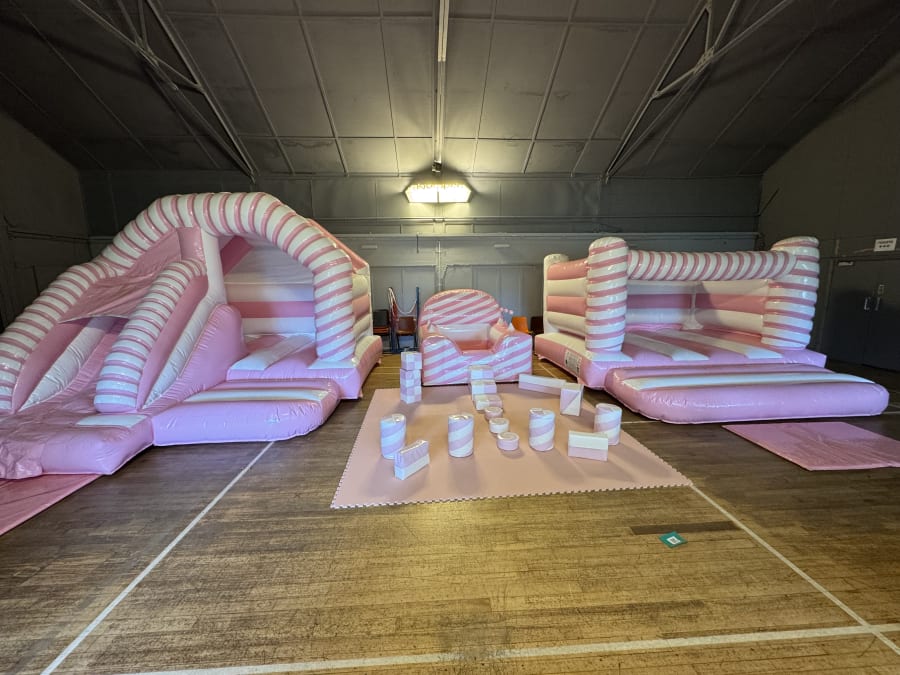 Make your next celebration unforgettable with the Super White & Pink Candy Cane Package. This charming bundle combines a bounce-and-slide castle, a low-height castle, an inflatable ball pool, and an 18-piece soft play set — Perfect for birthdays or any show stopping occasion indoor or outside!